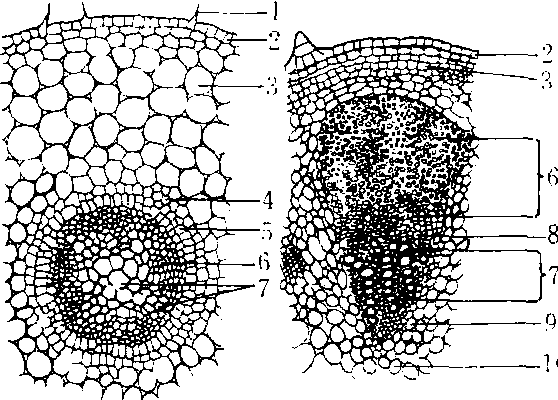根、茎成熟区的初生结构 a.棉根成熟区横切面 b. 向日葵茎成熟区横切面 1.根毛 2.表皮 3.皮层 4. 内皮层 5. 中柱鞘 6.初生韧皮部 7. 初生木质部 8.形成层 9.髓射线 10.髓 |