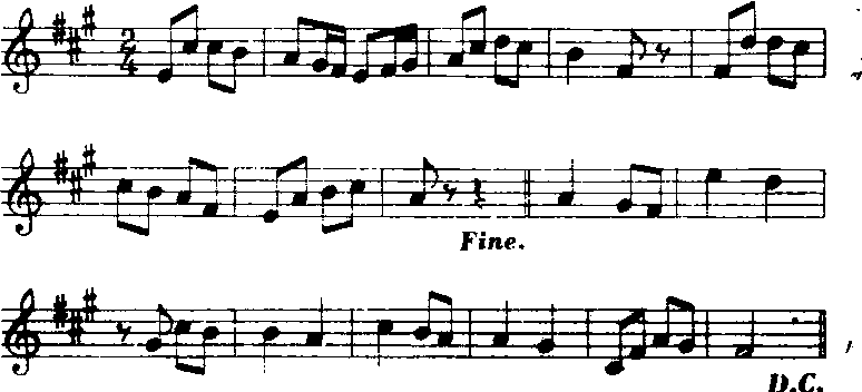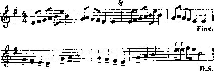 | 释义 | 三段体一首作品(或一段可以相对独立的音乐)由规模大体相当又同等重要的三个部分组成,这三个部分的作用各有不同,而又能组成一个完整的统一体,这样的曲式即名为“三段体”。三段体的第一部分是个正规乐段,用以完成一个乐思的初步陈述,但与二段体第一部分的乐段相比较,又可以有些不同。不同之处是:由于它随后展开的可能较多,因而在初步陈述中既可更留有余地,又可伏下一些有待发展的因素;而乐段的结束,则除了在原调之外,还可作转调的完全终止,构成转调乐段。三段体的类型,可根据其第三部分的情况划分为:“有再现的三段体”(如《歌唱祖国》,王莘词曲);“没有再现的三段体”(如《渔光曲》,安娥词、任光曲)。它们的标志是:前者,第三部分完全重复、基本重复或变化重复第一部分的音乐,其公式可标写为“AB A1”。后者,第三部分不重复第一部分的音乐,其公式可标写为“ABC”。根据中间部分运用主题材料的情况,有再现的三段体又可分作三类。一类是:“展开中部的三段体”,又称“单主题的三段体”(如肖邦《玛祖卡舞曲》作品33之2的开始部分,柴科夫斯基《四季》作品37a六月《船歌》的开始部分等),其特点为中间部分采用第一部分的主题材料进行展开——包括调性上的展开,和声上的展开,音调、节奏变化以及主题分解的展开等等。展开的方法和程度,取决于内容表现的需要。另一类是:“对比中部的三段体”,又称“双主题的三段体”(如贺绿汀《摇篮曲》、《牧童短笛》等),其特点为中间部分采用与第一部分主题材料不同的新材料,由此形成两个曲式部分之间比较鲜明的对比。对比的程度,同样取决于内容表现的需要。如果中间部分兼有以上两类的特征,即或者先展开后又引入对比材料;或者相反,先引入对比材料后又展开第一段的主题;或者展开与引入新材料同时结合出现,便构成了第三类——“混合性中部的三段体”(如格里格《摇篮曲》作品38之1)。没有再现的三段体中不存在这种分类。三段体曲式的各部分都可以重复,而且重复的可能多种多样,常见的有:‖:A:‖:B A1:‖(如贝多芬《第一交响曲》作品21第3乐章《小步舞曲》的开始部分);A‖:BA1:‖(如王莘《歌唱祖国》);‖A:‖BA1(如门德尔松《无词歌》作品62之3《葬礼进行曲》);‖:A:‖:B:‖:A1:‖(如瞿维《花鼓》)等。三段体由于发展的可能增多,规模的伸缩性增大,因而常常出现段落内部的扩充;段落之间的连接、过渡(主要是第二、三部分之间);段落结束后的补充以及全曲的尾声。三段体是一种很灵活的曲式,各部分的变化、重复和附加部分的出现,会使结构产生新的形态,因而带上若干其他曲式的因素(如带有变奏曲式、回旋曲式、奏鸣式的因素等)。三段体比二段体既有更多的发展余地,又有更充分的再现可能。因此,它的表现容量明显增大,结构过程更加平衡完整,运用范围非常广泛。多数歌曲、浪漫曲、歌剧中的咏叹调、器乐小品、舞曲、进行曲、前奏曲、标题小曲等,常以这种曲式写成。同时,三段体还可以作为大型、复杂曲式中的一部分。 三段体Sanduanti由三个乐段构成的乐曲形式,第三段通常重复第一段,用A+B+A公式表示。重复时可以完全不变或稍加改变。第二段称为中段,与第一、三两段形成对比。不加变化重复时,常在中段结束处标明D. C. (da capo al fine),表示从头反复到标有“fine”处为止。如下例。俄罗斯歌曲《夜莺》缩短重复时,标明DS(da segno al fine),表示从标有