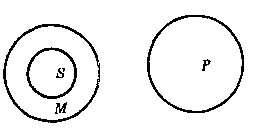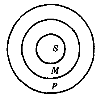 所有的平行四边形(M)都是对角相等的四边形(P), 所有的菱形(S)都是平行四边形, 所以,所有的菱形(S)都是对角相等的四边形(P). 三段论的根据是三段论的公理:凡对一类事物有所肯定,则对该类事物中的每一分子也应有所肯定;凡对一类事物有所否定,则对该类事物中的每一分子也应有所否定.三段论公理也可用概念的外延——集合来说明.图1表示:S⊆M,M⊆P,所以,S⊆P.图2表示:M∩P=Φ,S⊆M,所以S∩P=Φ.