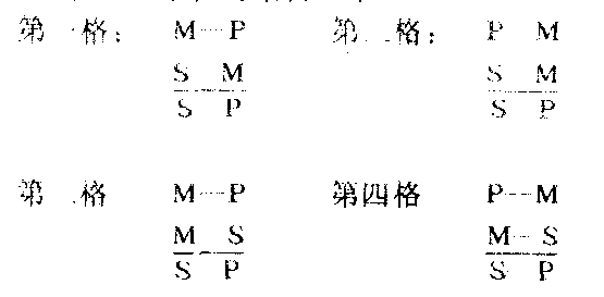由中项在前提中的位置不同而形成的三段论的不同形式。三段论有四个格:第一格,中项分别是大、小前提的主项和谓项;第二格,中项分别是大、小前提的谓项;第三格,中项分别是大、小前提的主项;第四格,中项分别是大、小前提的谓项和主项。用字母S、P、M分别表示小、大、中项,则四个格的结构如下: