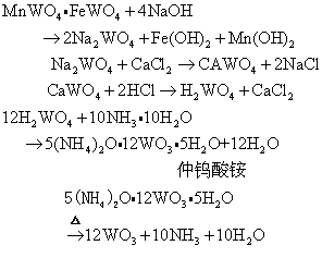 | 释义 | 三氧化钨sanyanghuawu又名钨华,化学式WO3。淡黄色斜方晶体,受热时颜色加深,冷却后又恢复为淡黄。空气中稳定,熔点为1473℃,沸点高于1750℃,相对密度为7.16。不溶于水和除氢氟酸外的无机酸,能溶于热浓氢氧化钠溶液和氨水。主要用于制造金属钨 (高温用氢气等还原剂还原),还用于制作硬质钨铁合金、防火织物、压电陶瓷和X射线屏等。也可用做陶瓷釉料的着色剂和分析试剂。由钨精矿 (锰、铁的钨酸盐) 经碱解,氯化钙转化,然后酸化生成黄钨酸,加氨水制得仲钨酸铵晶体,再经加热使晶体分解得到三氧化钨,主要反应如下: