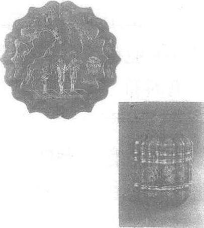 戗金仕女图朱漆奁 戗金的做法是,在朱漆或黑漆地上,以针或刀刻划出纤细的图案,在图案内填漆,然后把金箔或金粉粘贴进去,使之成为金黄色的纹饰。 |