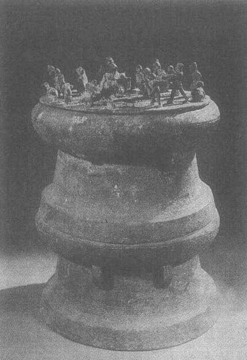 | 释义 | 战争场面铜贮贝器西汉。古代滇族统治者贮存贝币的用具。通高53.9厘米。云南省晋宁石寨山出土。云南省博物馆藏。此器的上下二鼓焊接而成,器内贮贝。鼓的胴、腰、足上分别饰有羽人木船图,牛形、舞人形纹,三角齿纹,涡纹等。在33厘米直径的器盖上则展现了一场浴血战斗的过程。战斗的双方,一方是昆明人,一方是滇人,胜方为滇人。今昆明市西南的滇池地区是古代滇国所在地。《华阳国志·南中志》:“滇池县,郡治,故滇国也。”战国至西汉时期,滇民族的活动范围在滇池区域。本世纪60年代,晋宁石寨山出土“滇王之印”金印一方,恰与武帝元封二年(公元109年)设“益州郡,赐滇王王印”的记载吻合。若干考古材料证明,晚不过西汉初,滇人已建立了以农耕为主的奴隶社会,文化比周围其它部族发达。昆明人居住在广大数千里的滇西地区。《史记·西南夷列传》:“其外西自国师以东,北至楪榆,名为嶲、昆明,皆编发,随畜迁徙,毋常处,毋君长,地方可数千里。”考古材料证明滇西地区的出土文物中有大量的农业生产工具,畜养业也较发达,并不完全是司马迁所说的“随畜迁徙,毋常处,毋君长”的游牧阶段生活,大体也进入了以农业为主,畜牧业发达的奴隶制阶段,只不过较滇民族要落后一些。西南边陲的云南地区在奴隶制阶段的各民族,除了从事农耕、畜牧、狩猎、纺织、青铜铸造等手工业外,往往要通过战争来掠夺财富和奴隶。此贮贝器盖上的战争场面即是一例。圆形器盖上,战争的双方共22人,马5匹,中心人物是身着戎装的滇人酋帅,他右手执矛,作刺杀状,前方一人摔倒在地拼命挣扎。滇人即将取得胜利,骑兵步兵协同作战的场面极憾动人心,有骑马驰骋者,有坠马落地者,有纵马俯冲的勇者,有弃马逃窜的败将。胜者愈战愈勇,败者人头落地,求饶者、被捆绑者历历在目。类似题材的作品在另一件战争场面贮贝器盖和其它器物上也有详尽的表现。西汉时期,滇人居住区域自然条件优越,与汉民族的关系更为密切,文化发达,这必然会遭到邻近部族的骚扰。滇人将战争胜利的内容表现在贮存贝币的器物上当然是胜利者的炫耀,同时也是对劲敌的防范和铭记。古代青铜手工业工匠通过自己熟练而高超的技艺塑造出的这一栩栩如生的杰作,无疑是我们了解古代云南地区社会制度、经济和文化的重要的历史见证。