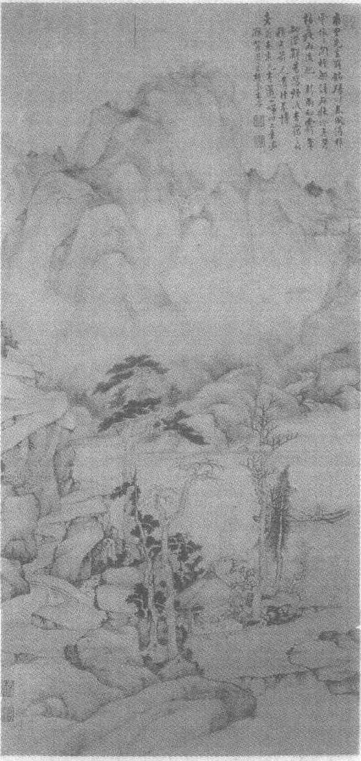 | 释义 | 戴本孝烟波春霭图轴清。戴本孝绘。纸本设色。纵150.6厘米,横73.2厘米。江苏省苏州博物馆藏。戴本孝见《戴本孝峻岭飞泉图轴》条目。这是一幅描写春日雨霁,文人垂钓归来的作品。作者取河流及两岸一段的景致,水面开阔,流势平缓,一文人荡舟其上,即将靠岸。彼岸峰峦起伏连绵,山腰处可望飞瀑,一道清流从山中舒卷而出,注入大河。远树含烟吐秀,岸边有苍岩巨石,石缝间绿树青草悄然而出,溪泉萦回浸溢。平台处建一茅亭,石桌上有摊开的书籍,显然是垂钓者的读书处。其周围,古松苍秀,梅花绽开,秃树即将复苏。作者以枯笔焦墨绘就了一幅意境清雅秀逸的山水作品,构图疏旷,侧笔干擦,笔墨简洁,设色柔和,充分展现了初春雨后云霭远离,大地复苏的迷人景观。
