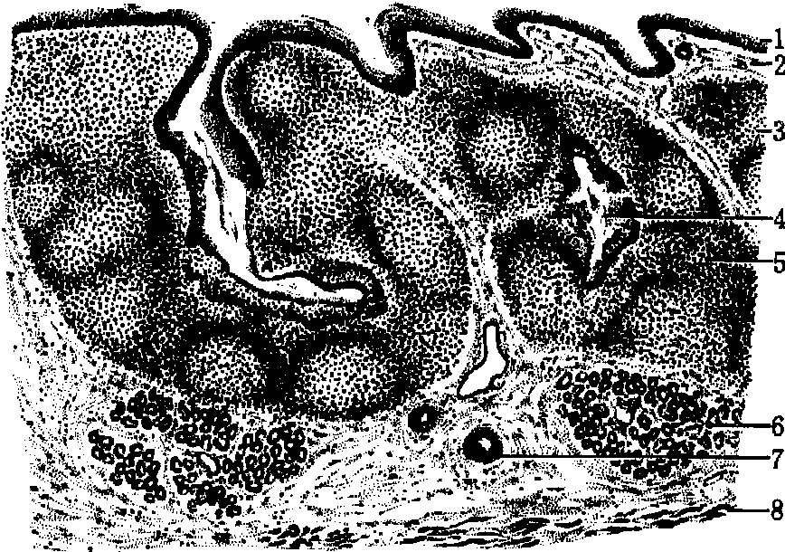 | 释义 | 扁桃体biantaoti人体鼻后孔的顶壁或咽与口腔、鼻腔交界处粘膜下淋巴组织所集成的团块,属于淋巴器官。主要包括位于咽峡侧壁、舌腭弓和咽腭弓之间的腭扁桃体、位于鼻咽部后壁的咽扁桃体和位于舌背后部的舌扁桃体。其中腭扁桃体最大,即为通常所说的扁桃腺。腭扁桃体呈扁卵圆形,表面盖着粘膜上皮,底面包着纤维被膜,与咽壁的肌层联系很松,易分离。表面15个左右的小隐窝,往往有食物或脓液在隐窝中存留,上部常易化脓,可能成为带菌的病灶,严重时应予摘除。 扁桃体fonsil位于舌根和咽部周围粘膜上皮下的块状淋巴组织。如腭扁桃体、咽扁桃体和舌扁桃体等。其中以腭扁桃体为最大,即通常所指的扁桃体。它是一对扁卵圆形体,其所在部位的粘膜上皮向固有层凹陷形成若干隐窝,散性淋巴组织和淋巴小结分布于隐窝周围,外面有结缔组织的被膜将其与固有层其它成分隔开(见图)。淋巴组织内大多为T细胞,还有B细胞、浆细胞、巨噬细胞和毛细血管后微静脉; 淋巴小结的帽与明区朝向粘膜上皮。受到抗原性刺激时,弥散性淋巴组织可增生,并形成大量淋巴小结。