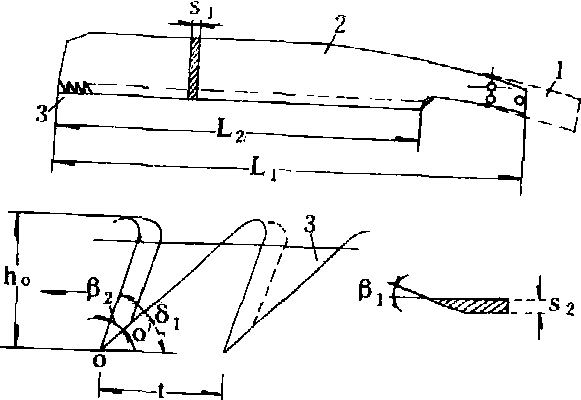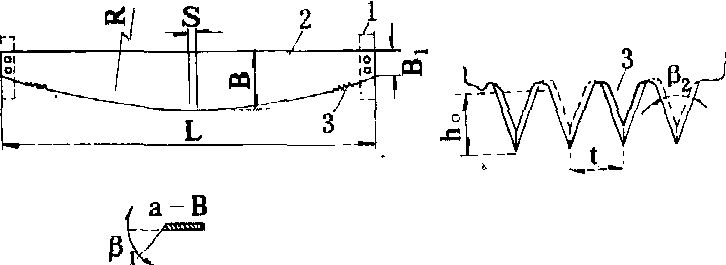 图1 双人锯 (S) 1.15~1.5毫米,宽(B)160~165毫米;锯齿厚2毫米左右,呈梯形断面,齿距(t) 12毫米,齿高(h0) 13毫米;锯板端部宽度(B1)不小于60毫米;齿顶线圆曲线半径(R)3000~3 500毫米;锯齿前刃锐利角(β1)40°,侧刃锐利角(β2) 55°。锯齿是双向工作的对称齿,无空行程。可锯大径木。伐木作业不安全,效率低,劳动强度大。 单人锯 由单人操作的手工伐木工具。又称弯把锯(图2)。中国于50年代开始推广使用。用T9碳素钢制成。锯板长(L1)560~1 040毫米,厚(s1)0.94~0.98毫米;锯齿部分长(L2)400~900毫米,齿厚(s2)1.49~1.53毫米,属于单向工作的非对称齿。OO′是