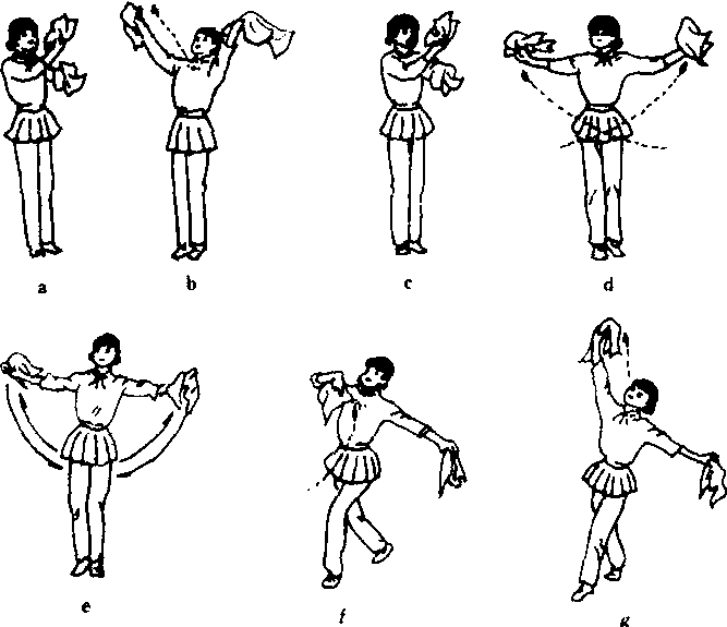 ❸常用手巾花。所用手巾为八角或正方形,全手攥住手巾一角,挽花时,手指不得张开。单臂花:一手做里挽花,方向节拍根据舞蹈者需要变化。双臂花:双手同时挽花。交替花:双手交替于胸前挽花。蚌壳花(亦称盖分花):第一拍双臂由上向下或由外向里做双挽花(图a); 第二拍双手做外挽花,由原路线回原位 (图b)。蝴蝶花(亦称十字花):第一拍双臂体前交叉手按掌位里挽花;第二拍经下弧线至体两侧做里挽花。双臂行走路线应是弧线形(图c、d)。扁担花:双臂于体两侧平伸双手里挽花,每拍一次或两拍一次。展翅花:双臂在体侧45°处做里挽花。也可在双手里挽花同时双臂下打,与身体相贴,然后迅速回原位(图e)。扬臂花:手臂由手腕带动,由下经体前向头上扬臂甩腕 (图f、g)。片花:掌心向上,以腕为轴,手掌向里平移,同时小臂稍抬起,从小臂下掏出指尖,向上转腕一圈成手心向上。外片花与之相反,可一拍或二拍完成。碎绕花:拇指、食指、中指捏着手巾,以手腕带动由外向里连续绕手巾称里碎花,由里向外绕称外碎花。