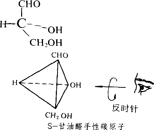 | 释义 | 手性碳原子shouxing tanyuanzi连接4个互不相同原子或原子团的碳原子,亦称不对称碳原子,其四面体结构有两种构型,这两种构型不能互相重叠,一般用 R-,S-标记法表示。R,S取自拉丁文Rectus和Sinister,意为“右”、“左”,但R,S构型与化合物旋光性的右旋左旋并无一定规律。判断手性碳原子的构型时,将4个原子与原子团按次序规则排列,如甘油醛分子中的4个原子和原子团排列为OH→CHO→CH2OH→H,将最后一个基团置于四面体顶端,另3个基团处于四面体底部,然后由四面体底部向顶端看,底部的3个基团按次序为顺时针方向排列的为R-型,按反时针方向排列的为S-型 (见下图)。