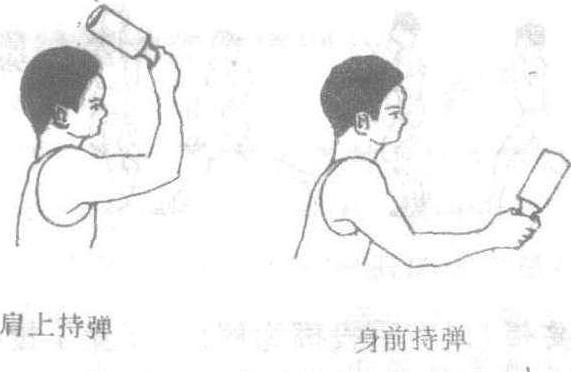 动作要领 (以右手投掷为例)❶握法。普通式:小指弯屈垫在弹柄下端,食指和拇指握住弹柄,其余两指顺势握在弹柄上。拳式握法:五指似握拳握住弹柄,拇指压在食指上,小指与弹柄末端齐平。 ❷持弹。肩上持弹法:投掷臂弯屈约90°,肘关节正对投掷方向,上臂约与肩齐平,使弹位于头右前上方。身前持弹法:持弹臂自然弯屈,持弹于体前,使弹与肩齐平或低于肩。 教学重点 拳式握弹法。这种握法对小学生较为适用。采用原地握弹与持弹,持弹慢跑等练习,以形成握,持弹动作。 |