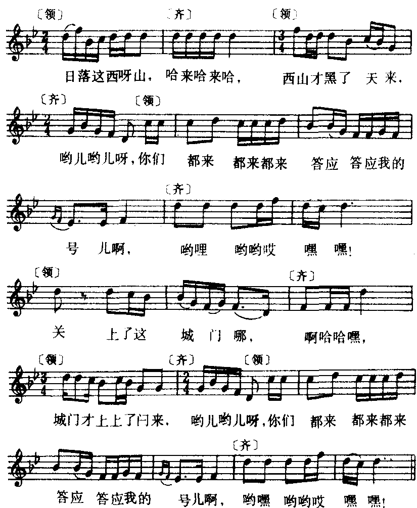 属于劳动号子。打夯时,一般由2~4人,同时作抬起并迅速打下的动作,其力度、速度、移动方向及节奏间歇等,均由领夯者唱打夯歌掌握,既严整紧凑,又允许一些自由处理和短暂停顿。打夯歌通常只唱衬词,其旋律朴素,结构短小,常作多次反复或变化进行,但也有的领唱者能够见景生情地即兴编词,在劳动过程中,时而豪迈地高歌,时而简短地对答、热烈地呼应,情绪活跃、风趣,富有浓厚的生活气息。例如河北遵化的打夯歌,就颇有特色。夯头,只是一段引子,它也标志着一个劳动过程的起始部分。歌词中反映出一派生动的景象:太阳就要落山了,工人们仍在愉快地劳动着,在这里,并没有什么“加油干哪”之类的话语,但那种炽热的情感,却透过生动有力的号子声,给人们留下了难忘的印象。