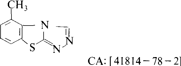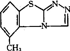 性能 纯品为白色结晶,熔点187~188℃,25℃时蒸气压为266.6448×10-7帕。25℃时溶解度为:水1.6克/升、二氯甲烷33%、乙醇25%、甲醇25%、丙酮10.4%、乙腈10.4%、环己酮10.0%、苯4.2%、二甲苯2.1%、氯仿>500克/升。性质稳定,不易被水和光分解,对热稳定。对温血动物具中等毒性。大鼠急性口服LD50为314毫克/千克、小鼠245毫克/千克,对家兔急性经皮>2000毫克/千克,大鼠急性吸入LC50>0.25毫克/升。对兔眼和皮肤有轻微刺激作用。对大鼠和小鼠两年饲喂试验的无作用剂量分别为275毫克/千克(8~24毫克/千克· 天)和400毫克/千克(29~46毫克/千克· 天),以275毫克/千克药量的三代繁殖试验,大鼠和小鼠均未见异常。在试验条件下,未见致突变、致畸和致癌作用。对野生和水生生物毒性较低.鲤鱼和虹鳟鱼急性LC50分别为14.6和7.7毫克/升,对蜜蜂无毒,对野鸭和鹌鹑的急性LC50>5000毫克/升。用250毫克/升三环唑溶液处理的桑叶喂蚕,对蚕茧和卵的重量有轻度影响。高选择性,对水稻稻瘟病有特效。内吸性强,易被水稻根、茎、叶吸收,并在植株体内传导。具有很强的抗冲刷能力,施药后1小时降雨,不影响防病效果。残效期长,施药1~2次即可有效地防治整个生长期的水稻稻瘟病。其作用机制是抑制孢子萌发和附着孢的形成,从而有效地阻止病菌的侵入和减少梨型孢孢子的产生。 应用 对苗期叶稻瘟病可采用育苗箱和田间苗床土壤处理方法防治,75%可湿性粉剂用量为2~5克/米2。本田叶稻瘟病在其刚发病或尚未发病时,喷洒可湿性粉剂,用量为有效成分150~300克/公顷。穗稻瘟病的防治是在未抽穗或刚抽穗时喷药,其用量为有效成分337.5克/公顷。是否需第二次喷药,视病情而定,一般用药不超过两次,两次用药的间隔期为10~ 20天。加工制剂为75%可湿性粉剂、20%可湿性粉剂。与其他农药混用不降低防病效果。对作物安全无药害。 三环唑难溶于水,不易光解,对热稳定。中等毒性。内吸性强,有双向传导作用。在植物体内、土壤内分解慢,残效期长。可用于防治稻瘟病。 三环唑tricyclazole又名比艳。杂环类杀菌剂。化学名称:5-甲基-1,2,4-三唑并(3,4-b)-苯并噻唑。化学结构式如下。原药为白色结晶,无味,在水中或阳光下分解缓慢,25℃时水中溶解度700 mg/kg,溶于丙酮、氯仿、乙腈、二氯甲烷乙醇、甲醇等。1975年由美国礼来公司开发。选择性内吸保护杀菌剂。主要用于水稻瘟病的防治。药剂对稻瘟菌无直接杀菌活性,离体下不影响孢子萌芽,附着孢形成和菌丝生长。但1mg/kg即可抑制病菌黑色素的合成,从而影响附着孢侵入丝的形成,抑制病菌的侵入。具有很强的内吸和运转性能,在植株体内和土壤中分解缓慢,残效期7~10周。可以拌种、蘸秧根或叶面喷洒,预防效果好。对人畜中等毒性,大鼠口服LD50为305mg/kg,以含275 mg/kg药量饲料喂大鼠3个月,未产生不良影响,安全间隔期30天,糙米允许残留量为2 mg/kg。