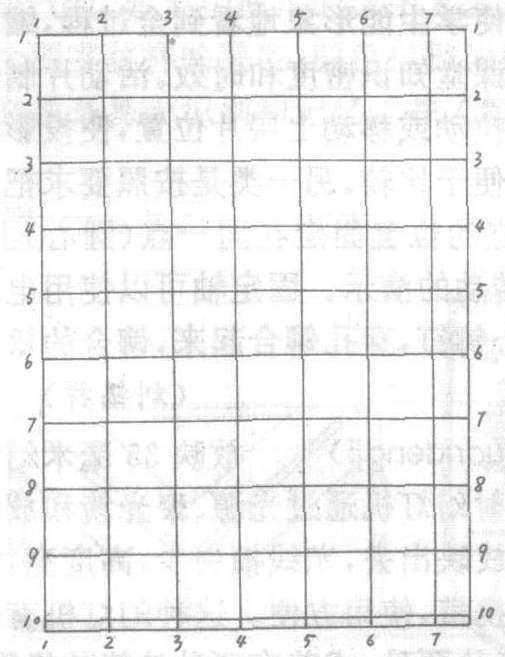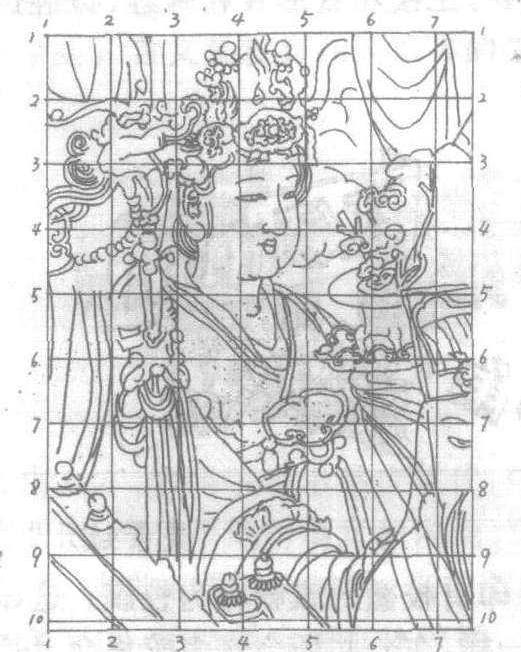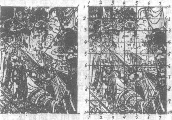 1.延长小样对角线,截取放大的画幅 2.将小样打出若干小方格在经纬线端标号
