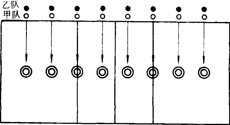 游戏方法 将参加游戏的学生分成人数相等的甲乙两队,站在排球场一侧边线外。教师发出口令后,比赛开始由甲队学生用手中的垒球或小木棒投掷自己前面的球,甲队投掷后迅速将击跑的球放回原位置,将垒球或木棒捡回交给身后的乙队学生。乙队学生按照以上方法继续进行比赛,两队比赛结束以后,比较甲乙两队的积分,积分多者为胜一局,可连续进行若干局比赛。 游戏规则 ❶击球时不能踏线或跨过边线。 ❷击球出圈得1分。 |