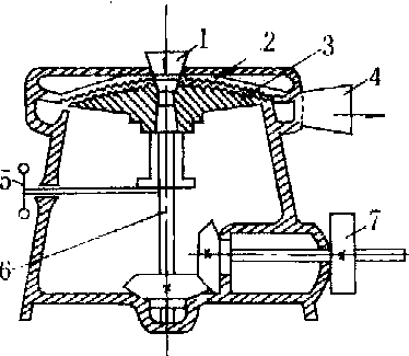 图2 锤式打磨机 齿盘式打磨机 结构如图3。其再碎是通过研磨作用来达到的。主要部件为上下齿盘,刨花和木片在回转的下磨盘和固定的上磨盘之间被研磨。原料从顶部料口落下,经上磨盘圆孔落在下磨盘中心的甩料螺旋上。随着磨盘的回转,刨花和木片被均匀地抛向磨盘四周,被上、下磨盘切碎成狭长刨花,由出料口排出。调节磨盘的间隙,即可调节刨花的最终尺寸范围。 打磨机中加工的原料比较细碎,原料含水率也较低,要特别注意防止金属物和石块混入,以免引起机械损坏和火灾事故。