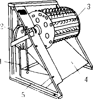打稻机 1.脚踏板 2. 传动齿轮 3.弓丝齿脱粒滚筒 4.滑扳 5. 机架 |