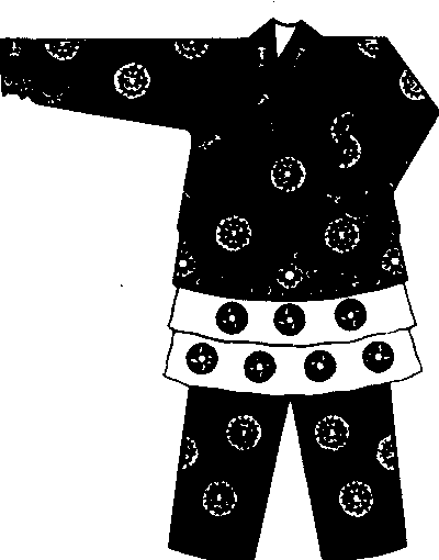 又称“英雄衣”、“豹衣豹裤”。多为短打武生扮演英雄义士、草寇时穿用。大领大襟、束袖,下衣边有打褶白绸2层,称为“走水”。裤袄同色,缎制,上绣小团花等纹样。