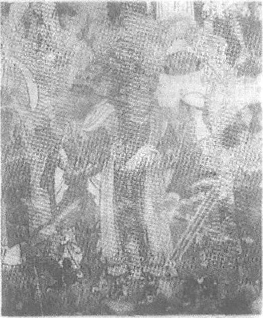 | 释义 | 三界诸神图(元朝差吏)壁画明。纵70厘米,横57厘米。河北省石家庄市西北郊上京村毗卢寺后殿南壁东部下层壁画。画面上共5人,着元朝差吏服装。中间两位头戴覆盆式帽,高鼻,深目,虬髯,从形象判断可能是色目人,一位手拿文书在指点,另一位双手高举一展开的文书,似在大声宣读。身旁一位穿红袍佩剑者可能是差役。画面的左侧两位持物者一位似在聆听,一位神情怪诞。此画人物形象各异,特征明显,十分生动,具有鲜明的元代风格。
