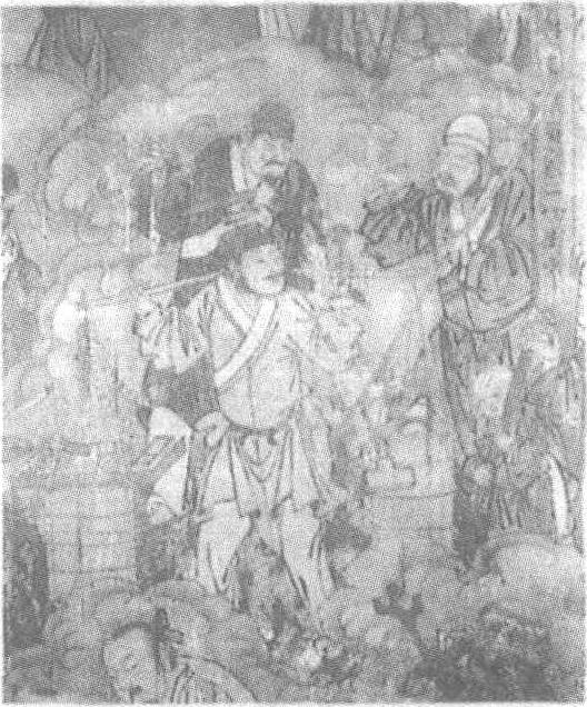 | 释义 | 三界诸神图(街市)壁画明。纵50厘米,横40.4厘米。河北省石家庄市西北郊上京村毗卢寺后殿南壁东部中层壁画。此画面的主要位置上绘一位货郎,一副短衣打扮,货担担于右肩,担上满置各类杂货。左手高举一拨楞鼓,张口似在高声叫卖。其左后方一个盲人算命者手持长棍,也在张口招揽顾客。货郎身后是一位泥瓦匠,他手持工具,静观眼前的闹市,似作工间的短暂休息。一个幼儿立于货担旁,双目充满探询,形象天真活泼。此街市场景虽无更多人物,但简练概括,人物神态逼真,具有强烈的生活气息。