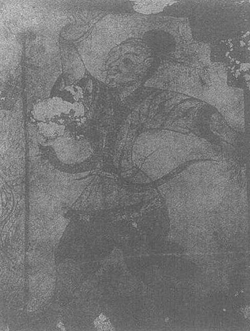 | 释义 | 托梁力士像壁画高句丽(公元5世纪)。纵135厘米,横110厘米。吉林省集安县三室墓第三室东壁壁画。1975年清理。此力士在影绘建筑之下分足而立,膝微曲以使重心向下。右手托梁枋,左手撑立柱。身穿左衽短襦,红色平膝裤,束红腰带,装束与他的动作协调,给人以精干利落的感觉。他的右臂盘绕一条粗蛇,脸上却笑容满面,越发显示出他的力大无穷和神人的特点,令人耳目一新。此图线条流畅,运笔豪放,色彩明快,是高句丽绘画的优秀作品。
