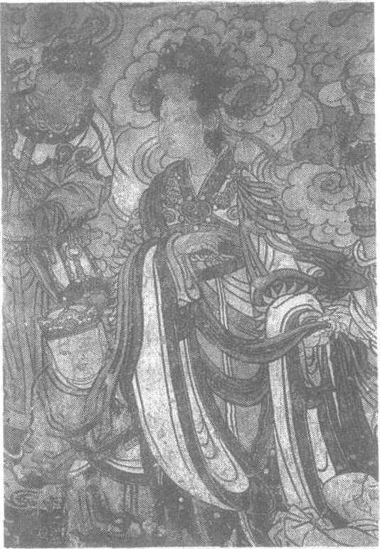 | 释义 | 三界诸神图(鬼子母)壁画元。纵108厘米,横82厘米。山西省稷山县青龙寺腰殿西壁中部下层壁画。鬼子母原本凶恶,残食他人之子,受释迦牟尼度化后,改做善事,保护幼子,受人供奉。图中的鬼子母头戴花冠,宽衣飘垂,帔帛缠身,面庞清秀,五官端正,具有温柔娴静之情。身旁牵一幼子,面目可爱,双目炯炯有神,动作中透出灵气。其身后有一持剑武士跟随。鬼子母的左后方一戴手镯的幼儿在掩目啼哭,为画面增添了浓厚的生活气息。