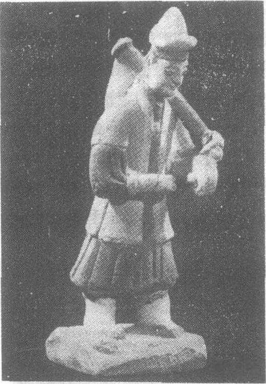 | 释义 | 扛旗石俑明嘉靖三十九年(公元1560年)。高23厘米。1973年四川省铜梁县明代石椁墓1号出土。旗俑头戴圆盆尖顶帽,身着至膝长袍,外罩半袖无领坎肩,足蹬高靴,右手弯至腹前,左肩扛旗、低头沉思着作缓行状,与另一个右肩扛旗的石俑为一对。他浓眉大眼,高鼻小嘴,凝重的表情里流露着敏锐的灵气。俑神态生动,动感十足,一眼望去,如同一个活生生的小人,因陷入遐思而漫无目的地游荡着,是一件值得品味的艺术品。在铜梁的六座明代石椁墓中,共出土了一百多件石俑,多为仪仗和侍从俑,如肩舆俑、骑马仪仗俑、牵马俑、负物俑、鸣锣俑、扛旗俑、捧物俑等。这些石俑不但造型生动,雕刻精细,且衣着穿戴各依人物身分而异。如文吏戴素冠,着宽袖袍,武士俑戴圆盆帽,或戴盔披甲,普通的侍者,执仗者则为民间一般服装形式。以帽子为例,普通俑所戴的圆形尖顶帽,圆盆尖顶帽,圆盆帽,圆形平顶帽等,都是明代民间流行的式样。这些石俑不仅形象地显示了明代刺史一类官吏出巡的场面,还为研究明代民间服饰提供了丰富的形象资料。