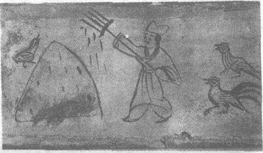 西晋。甘肃省嘉峪关市5号墓前室东壁砖画。1972年至1973年发掘。画面表现的是场院情景,谷物堆积如小丘,一农夫在挥杈扬谷,谷子从木杈的空隙间纷纷扬扬洒落,几只鸡在场边漫步啄食。画工显然接近生活,对农业生产十分熟悉,因而能以简洁而富有情趣的画面,将农夫丰收的喜悦气氛表现得生动而贴切。