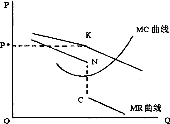 | 释义 | 扭折(或纽结)的需求曲线在现行价格水平上出现一个扭折点的需求曲线,相应的边际收益曲线是不连续的。这是寡头垄断市场理论中的一种观点。P*为市场上现行的价格水平,在P*以上需求富有弹性,在P*以下需求缺乏弹性,因而K点以下和以上的需求曲线的斜率不同。如果厂商以利润最大化为目标,那么边际成本的变动只要不超出边际收益曲线的不连续部分(NC),价格就会稳定不变。如图: |