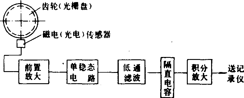 图3 非接触扭振仪原理框图 感应出的脉冲信号重复频率不变,当存在扭振时就感应出扭振相应的脉冲重复频率变化的信号,经前置放大推动单稳态电路工作,发出的单稳信号其重复频率变化相应于扭振角速度的变化,经低通滤波转换成电压变化波动再经电容隔去直流成分,积分后就获得相应于扭振角位移变化的电压波动。这种仪器并伴随有扭振测量,谐波分析,波形记录置于一体的型式,具有结构简单、使用方便、便于分析等优点。 |