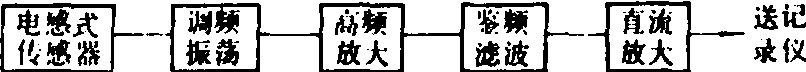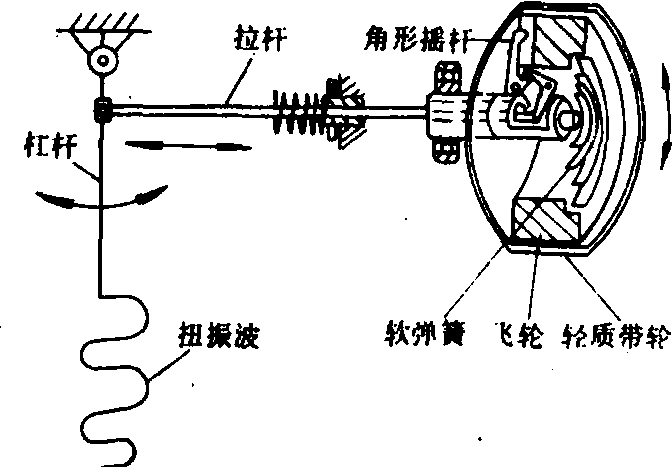 图1 盖格尔扭振仪工作原理示意图 轴产生的扭振角位移,通过不可伸长的皮带或专用弹性联轴节传至轻质带轮,由于它的惯性很小而能随扭振轴一起振动,惯量很大的飞轮借一个不能传递高频振动的软弹簧与轻质带轮相联只作“匀速”回转,这样转轴上的扭转振动就反映为轻质带轮与飞轮间的相对位移,并通过装在轻质带轮上(一头嵌入飞轮)的一对互相垂直的角形摇杆,将相对角位移转为拉杆的往复运动,经杠杆放大将扭振波录于记录纸上。另有定频振子和记时器同时记录绝对与相对时间供扭振谐波分析。电测式扭振仪 有惯性式(接触式)与非接触式两种型式。惯性式扭振仪具有与机械式扭振仪相似的拾振器,并可将其扭振产生的相对角位移机械量转为电阻、电容或电感量。最常用的为电感调频式扭振仪,工作原理如图2所示。传感器将轴系的扭振信号转换成