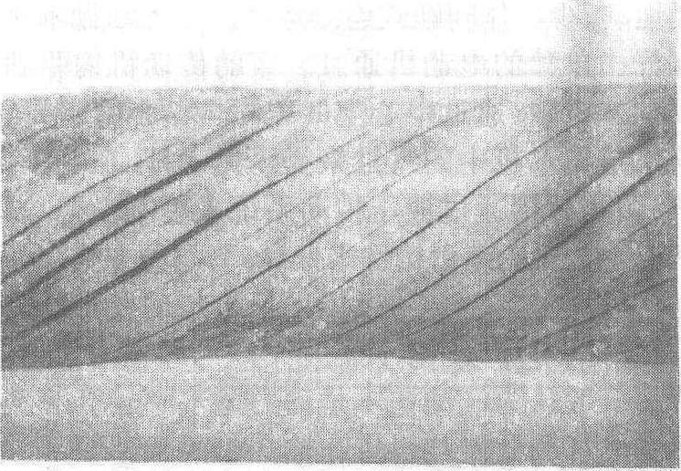 图1 树干的扭转纹 一方,随树龄增大扭转角度继续加大,以致在一树株内,距髓心愈远即最外部分的木材,纹理扭转的程度也愈严重。对于阔叶树材的扭转纹,其扭转方向常与针叶树材相反。热带和亚热带的阔叶树材,扭转纹极为常见,如枫香、蓝果树以及桉属中的一些树种。锯材的斜纹,除了由于原木有扭转纹,还可能由于未平行原木长轴锯解所造成的。节子附近木材的纹理弯曲,常形成局部斜纹,如涡纹。斜纹以其倾斜高度与水平长度的百分比或以倾斜坡度表示。扭转纹对木材利用的影响取决于扭转纹的严重程度和木材的用途,具有扭转纹的原木加工为锯材时,则