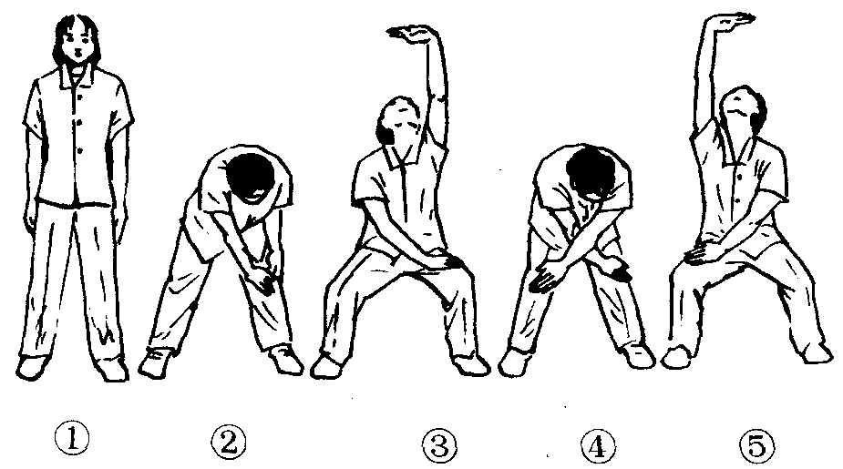 练功十八法第3套第4节。动作过程:两脚分立,与肩同宽。(图2—4—136—❶)❶上体前屈,右手扶于左膝上。(图2—4—136—❷)❷上体正直,左臂前上举成托掌,同时屈膝半蹲成马步。(图2—4—136—❸)❸上体前屈,两腿伸直,左手扶右膝。(图2—4—136—❹)❹同❷势一样,只是做右臂上举托掌。(图2—4—136—❺)❺同❸势一样,右手扶左膝。❻同❷势。❼同❸势。❽还原。共做4个8拍。此功法对于腰、腿酸痛有一定疗效。