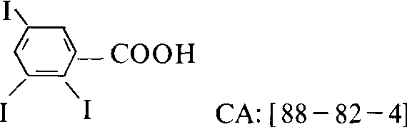 性能 纯品浅褐色结晶粉末,熔点345℃,水中溶解度1.4%,甲醇中溶解度21%,溶于酒精、丙酮、乙醚、苯和甲醇。三碘苯甲酸二甲胺盐熔点226~228℃,溶于水。低毒。小白鼠急性口服LD50是700毫克/千克(纯品),大白鼠LD50是813毫克/千克(工业品),大白鼠急性经皮LD50>10200毫克/千克,小白鼠腹腔注射致死最低量为1024毫克/千克。鲤鱼TLm(48小时)>40毫克/升,水蚤LC50(3小时)>40毫克/升。三碘苯甲酸可经由叶、嫩枝吸收,然后进入到植株体内,阻抑吲哚乙酸由上向基部的极性运输,故可控制植株的顶端生长,矮化植株,促进侧芽、分枝和花芽的形成。 应用 主要应用在大豆上,大豆开化初期—盛花期,以200~300毫克/升叶面喷洒一次,可使大豆茎秆粗壮,防止倒伏,促进开花结荚,增加产量,但不同品种效果不一。花生盛花期,以200毫克/升药液喷洒一次,土豆现蕾期以100毫克/升药液喷洒一次,甘薯以150毫克/升药液喷洒一次,皆有促进结荚或增加块茎块根产量的效果。为促进桑树多生侧枝,在其生长旺盛期,以300~450毫克/升药液喷洒1~2次,增加分枝和叶数。它还是国光和红玉苹果脱叶剂,在采收前30天,以300~ 450毫克/升全株或在着果枝附近喷洒一次,可取得满意的脱叶效果,促进果实着色。在苹果盛花期使用,有疏花疏果作用。 三碘苯甲酸2,3,5-triiodobenzoic acid,TIBA商品名为Regim-8。一种人工合成的抗生长素。分子式为C7H3I3O2,化学结构式如下。分子量500.92,菱形晶体,溶于乙醚、热乙醇,微溶于水。主要作用是抑制生长,消除顶端优势,增加分枝,促进花芽形成和开花。低浓度(0.5 mg/kg)可促进生长。大豆、豌豆、苹果等适量施用后可增产。