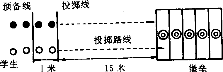 适用于5—6年级。可以提高学生的投掷能力。器材 手榴弹2枚。场地 在操场或空地上画两条相距1米的平行线,每隔5米画一横线为一个区,共画出五个区,由远而近标出2、4、6、8、10五个数字,并在各区的正中间画一个直径1米的圆圈作为堡垒。游戏方法 把参加游戏的学生分成人数相等的两个队,各成纵队站在预备线后。排头学生各持一枚手榴弹站在投掷线后,每队选一名学生负责统计成绩。教师发令后,两位排头学生依次投弹,手榴弹落到某一区内即为所得分。如打中堡垒加倍得分。第一名学生投完后,听教师拾弹口令后,捡回手榴弹交给本队第二名学生,自己站在队尾。依次进行。两队投完后,由负责记分的学生累积记分, 以积分多的队为胜。
