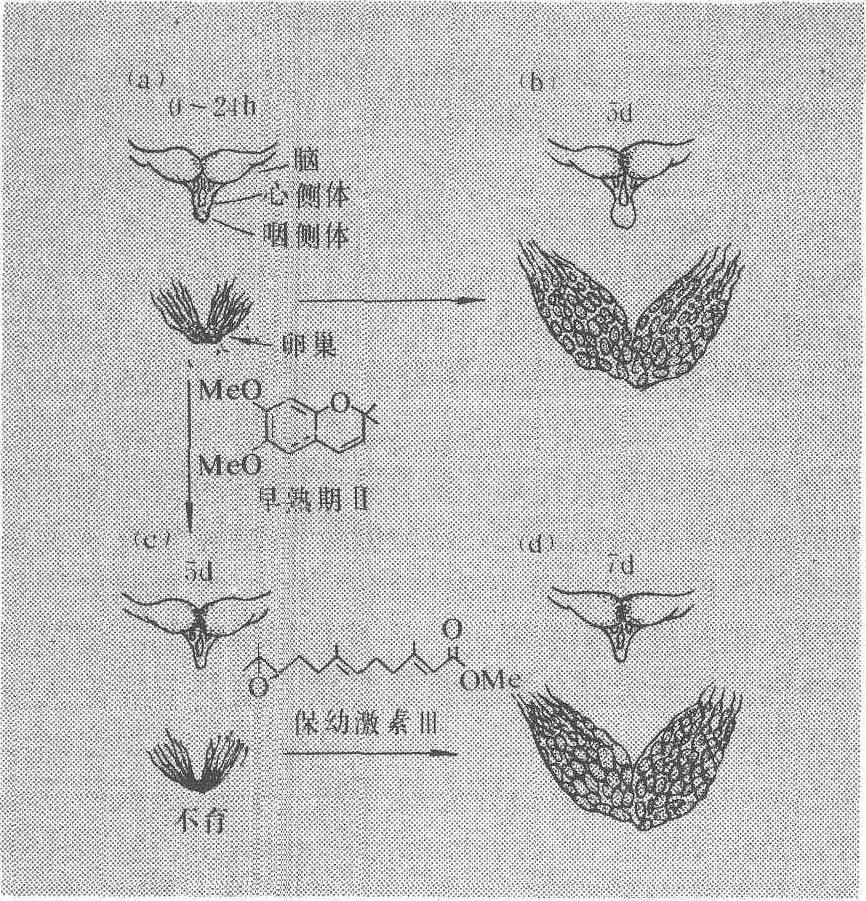 c→d:被早熟素导致不育的雌蝽在追加外源保幼激素后,虽不能恢复咽侧体的发育,但卵巢发育正常,说明卵巢也是早熟素的靶器官