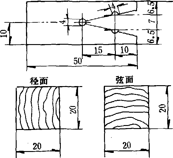 | 释义 | 抗劈力cleavage木材抵抗劈开的能力。抗劈力的大小反映木材沿纹理方向劈开的难易和木材钉钉的效果等,对选择适当的箱板、工具柄、建筑构件的连接、地板、家具、纺织木梭、车辆等用材时,木材的抗劈力具有一定的参考意义。使木材劈开的力如同楔子的作用,抗劈力集中于木材裂口的底部,在破坏面上的应力分布是不均匀的。中国国家标准GB 1942—82《木材抗劈力试验方法》,规定了试验抗劈力试样的尺寸和形状如下图,试件分木材的径、弦面,放在试机的