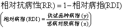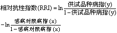 相对抗病性的准确程度取决于对照品种的病情,当对照品种发病率在95%左右时,相对抗病性代表真实的抗病性。诱发强度过大,供试品种与感病的对照品种病情指数差距小,相对病指增高,相对抗病性降低; 反之,相对抗病性升高,都不能确切地反映供试品种的真实抗病性。 ❺相对抗性指数法。此法可消除对照品种和诱发强度对抗病性表现的影响,真实反映抗病性的功能,其计算公式为: