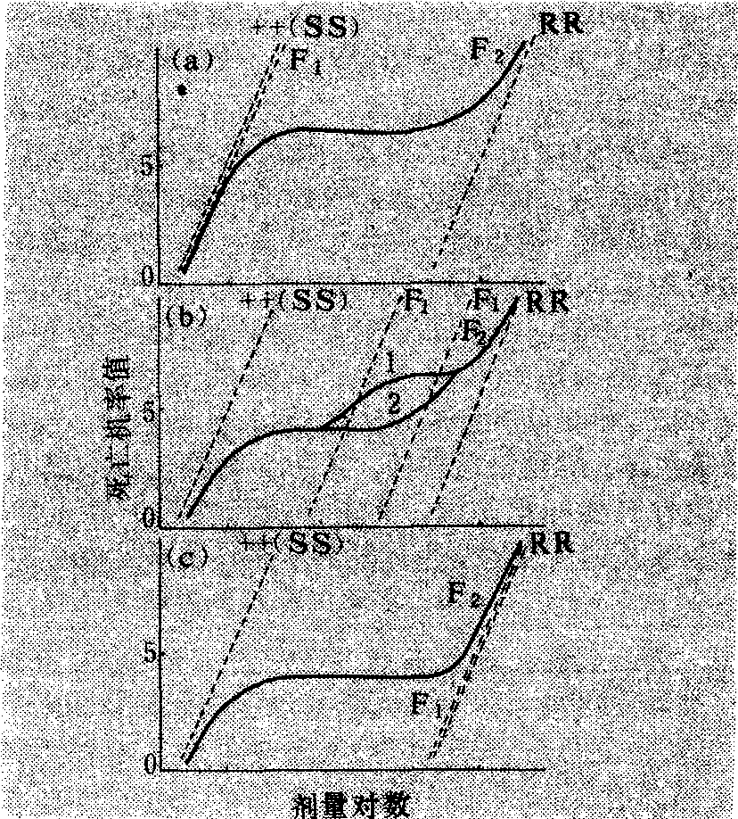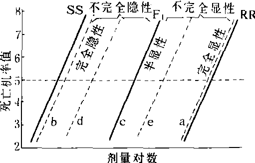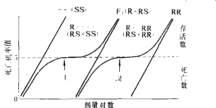 注:括弧中的a,b,c,d和e分别代表图1中的LD-p线。 性连锁及其测定 若互交F1的雌雄比例无明显差异,则R因子位于常染色体。如果所有的雄性是抗药性的,所有的雌性是敏感的,则表明涉及性连锁,或涉及常染色体雄性决定因子(autosomalmale-determining factor)。例如家蝇中的性限制滴滴涕抗药性就是一例。 单因子和多因子遗传及其测定 如果每个基因型的LD-p线互相不重叠,而R基因又是完全隐性,则F2的LD-p线约在死亡率75%(机率值5.675)处有一个明显的“平坡”,即表示敏感的和抗药性的表现型为3∶1(图2a)。这一平坡即为有效诊断剂量,又称区分剂量的范围。如果抗药性表现型的水平不是很高,则就不会有明显的平坡。 在完全显性时,死亡率25%(机率值4.326)处有一个明显的平坡(图2c),表示抗药性表现型(RR和R+)和敏感(++或SS)的分离比例为3:1。 若为半显性时,F2的分离应是敏感纯合子(++):杂合子(R+):抗药性纯合子(RR)=1:2:1。若它们的LD-p线互相不重叠,则F2的LD-p线在死亡率25%和75%处各有一个明显的平坡(图2b线1)。但是在大多数交配试验中,杂合子的抗药性程度取决于R基因的显性度。因此,在杂合子的LD-p线和任何一个亲本品系的LD-p线互相重叠时,也许只有一个平坡(图2b线2)。 在R+和++(或RR)回交时,其F1的LD-p