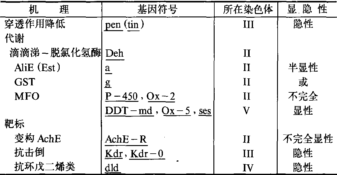 图3 R+和++及R+和RR回交F1的LD-p线 (据本增久等,1964) ❶和 在RR、R+和++基因型的LD-p线部分重叠时,则必须计算F2和回交F1对每一个剂量浓度的反应期望值。在F2中: xy=0.25w(++)+0.5w (R+)+0.25w(RR)在F1(R+)与++(或RR)回交中: xy=0.5w (+R)+0.5w(++或RR) 上两式中,xy为剂量 y时的期望值; w为++、+R和RR基因型在剂量y时的观察值,即直接从相应的LD-p线上获得。在涉及两个因子以上的多因子时,情况就更为复杂。难于用LD-p线的形状变化来推测。一般讲,若F2的LD-p线几乎呈直线形状,则可视为多因子遗传。 连锁群分析 从上可见,抗药性可涉及一个或几个遗传因子。如要确定抗药性基因在染色体上的位置及其连锁群,则必须应用标记品系。由于大多数昆虫遗传组成太复杂,特别是农业害虫,染色体数目多达50~60对,现在抗药性遗传的研究仅局限于双翅目的果蝇、家蝇和蚊虫等。家蝇的染色体数目为2n= 12,即6对染色体,其中1对为性染色体,5对为常染色体。除性染色体外,其余5对染色体均已有多种隐性突变标记基因。其主要抗药性因子的连锁群, 各个R基因所在的染色体及其显隐性关系见表2。 表2 家蝇抗药性基因的连锁群