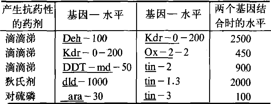 几乎所有涉及代谢的因子都位于染色体Ⅱ上,而且都呈显性。另外,控制不同形式的多功能氧化酶(MFO)的基因也是不同的。在家蝇中,与滴滴涕氧化作用有关的MFO基因(ses,DDT-md和Ox-2)位于第V染色体,而与有机磷、氨基甲酸酯抗药性有关的MFO基因(Ox-2和P-450)位于第Ⅱ染色体。 基因相互作用 R基因相互作用时对抗药性水平的影响见表3。两个基因结合时对抗药性水平的影响