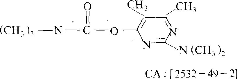 性能 纯品为无色无味结晶体,熔点90.5℃,30℃时蒸气压为4.0×10-3帕,25℃时水中溶解度为2.7毫克/毫升,溶于大多数有机溶剂,易溶于醇、酮、酯、芳烃、氯代烷烃。在一般条件下比较稳定,但遇强酸或强碱,或在酸碱中煮沸则分解,紫外光照易分解。同酸形成很好的结晶,并易溶于水,也易吸潮。在应用中对一般金属设备不腐蚀。对高等动物毒性中等,大鼠急性口服LD50为147毫克/千克,小鼠为107毫克/千克,家禽为25~50毫克/千克,狗为100~200毫克/千克,大鼠急性经皮LD50>500毫克/千克。对皮肤和眼睛无刺激作用。在试验剂量范围内对动物无致突变、无致畸和无致癌作用,在三代繁殖试验和神经毒性试验中未见异常,两年喂养试验无作用剂量,大鼠为12.5毫克/(千克·天),狗为1.8毫克/(千克·天)。对鱼类、水生生物低毒,对大多数鱼类LC50为32~36毫克/千克,对蜜蜂和鸟类亦低毒,蜜蜂急性经口LD50为1314微克/只,鸟经口LD50为17.2毫克/千克。选择性强,对蚜虫有强烈触杀作用,对蚜虫天敌毒性很低。在20℃以上时有熏蒸作用,对植物叶面有一定渗透性。作用机制为抑制胆碱酯酶。 应用 施药后数分钟即可迅速杀死蚜虫,对蚜虫传播的病毒病有较好防治作用,残效期短,对作物安全,不伤天敌,是害虫综合防治的理想药剂;对蜜蜂安全,可提高作物的授粉率,增加产量。主要以喷洒形式使用,防治蔬菜、烟草、油菜、花生、大豆、小麦、高粱上的蚜虫,但对棉蚜无效。 抗蚜威pirimicarb又名辟蚜雾、pirimor、Aphox、Afi-cida。强选择性氨基甲酸酯杀蚜虫剂。化学名称:5,6-二甲基-2-二甲氨基-4-嘧啶基-二甲基氨基甲酸酯。化学结构式如下。原药白 色结 晶,熔 点90.5℃,25℃时蒸气压213.3×10-5 Pa,溶解度25℃时,水中为2 700mg/kg。易溶于醇、酮、芳烃及氯芳烃溶剂。可用于果树、谷类、浆果类、豆类、甘蓝、油菜、甜菜、马铃薯、花卉、烟草及其他经济作物上防治蚜虫,对蚜虫天敌无影响。中等毒性,口服LD50 (mg/kg ),大鼠(♂)148、大鼠(♀)127,小鼠(♂)79,小鼠(♀)81,狗100~200,家禽25~50。经皮LD50>1000 mg/kg。对鱼低毒TLM(48 h)为40 mg/kg。