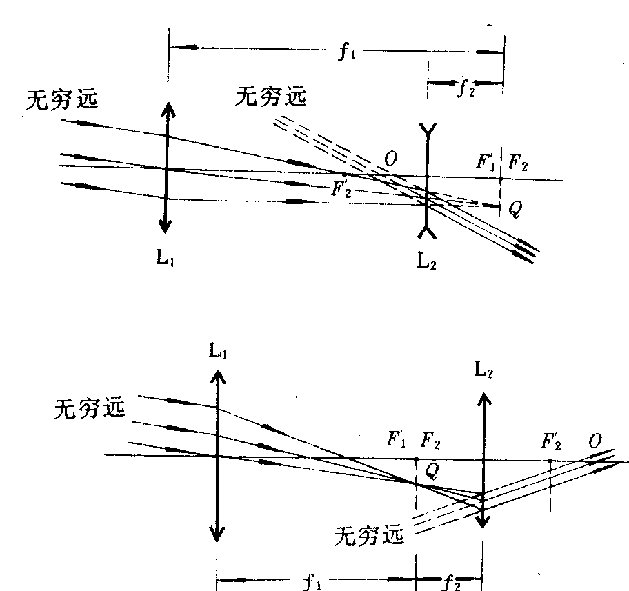 | 释义 | 折射望远镜zheshe wangyuanjing用透镜组成的望远镜。是荷兰工匠李普希于1608年发明的。有伽利略望远镜和开普勒望远镜两种,构造与光路如图所示。折射望远镜的物镜都是长焦距的凸透镜(图中L1)。伽利略望远镜用凹透镜L2作目镜,并使其第 一焦点F2与物镜的第 二焦点F'1重合。无限远处物体发出的平行光束经物镜L1成像于目镜L2的第 一焦平面的Q点,再以Q为物成正立虚像于无限远处。望远镜镜筒全长为物镜焦距f1与目镜焦距f2的绝对值之差。由于目镜是发散透镜,最后透射出来的各平行光束所共同通过的O点在镜筒之内,在目镜外不可能看到所有光束,因而视场较小,而且视场随放大率的增大而减小。为使视场不致太小,只能有较小的放大率,一般不超过6倍。又由于没有形成中间实像,所以无法放置叉丝及刻度尺,不能作瞄准和定位用。因为成正立像,可做一般观察用,如作观剧镜。伽利略用这种望远镜发现木星的卫星和月球表面有山谷,故得名伽利略望远镜。开普勒望远镜的目镜L2是短焦距的凸透镜。也让物镜的第二焦点与目镜的第一焦点重合,因而无限远处来的平行光束在焦平面上成实像Q,再经L2成倒立虚像于无限远处。镜筒长等于物镜与目镜焦距之和,较伽利略望远镜的镜筒长,手持不便。可以在物镜的第二焦平面上放置叉丝与刻度尺,可用于瞄准、定位和测量。由于成倒立像,可作天文望远镜,也可用在对专设目标进行瞄准和测量的大地测量仪器中。如果在开普勒望远镜中加入倒像系统,可用于地面观察。最大孔径的折射望远镜是美国耶凯斯天文台上的天文望远镜,其物镜是直径为1米的凸透镜。折射望远镜的缺点是有色差,制造大孔径的透镜较为困难,所以天文望远镜多用反射望远镜。