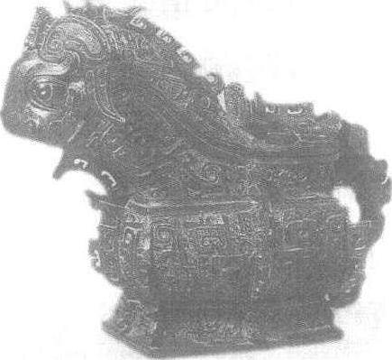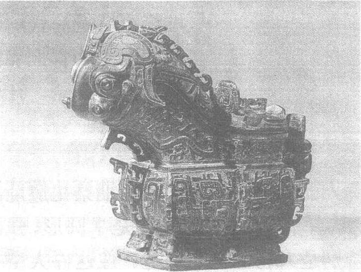 折觥 铜觥,是古代盛酒的器皿,盛行于商代和西周初期。器物造型 一般呈椭圆形,有盖和鋬。古代匠师常常将器盖做成兽头状,也有将整个造型做成奇形异兽。这件以“折” 命名的铜觥就是由鸟兽形组合的装饰雕塑。觥盖前端为羊头形,双角下垂,宽鼻鼓眼,气势逼人; 觥盖后端为兽面,巨目咧嘴,夔龙出双角,翅出器外。背后以兽头、立鸟、象首组成的圆雕为饰。觥的周身满饰兽面、夔龙纹浮雕、透雕,整体造型庄重中见华美,谨严中见活泼,显示出周初青铜器风格的悄然变化。 折觥器盖和器物内壁各有相同铭文40字。为周昭王19年作册折所制,故以“折觥”命名。 折觥西周早期制品,1976年12月在陕西省扶风县一窖藏中出土,现为陕西省周原文物管理所收藏。觥高28.7厘米,长38厘米。觥体由兽首形盖和长方形器身构成。器体上部有前倾、上翘的宽流,器口轮廓线曲折优美。下部主体呈长方形,腹略鼓,圈足外撇。器口上覆以鼓凸的异形盖,盖前端呈羊首形,曲角鼓目,面目狰狞,额上双角间夹小兽首,顶有伏龙。盖后端作兽面形,巨目咧嘴,眉作卷曲夔龙形。盖面两侧和器流口下皆饰回首夔纹。腹部主体纹饰为两条对称的夔龙组成的兽面纹。圈足也饰回首夔纹。体侧有圆雕兽形图,集三种动物像于 一身,上为兽首,中间作飞鸟形,下接低垂钩卷的象鼻,组合巧妙,与器身、盖衔接自然,浑然一体。盖面、器身四角及四面中线皆饰扉棱,均为透雕钩齿状,使整体造型、装饰和谐统 一,更加雄奇瑰丽。整个器形宛如一拱首垂尾的异兽,威猛、神秘,气势夺人。
