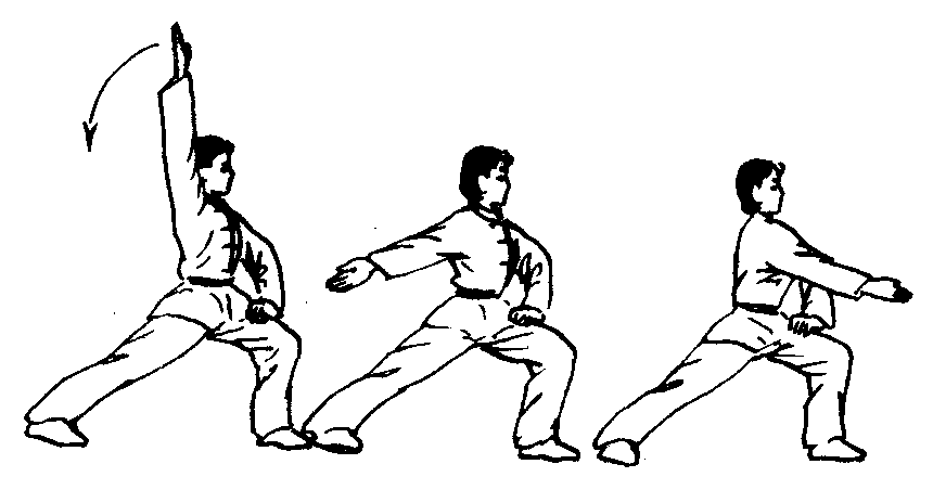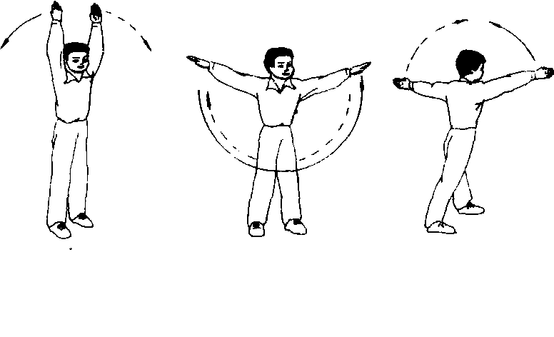 围绕肩关节抡转手臂的动作。包括单臂绕环、双臂绕环和交叉绕环等。此练习可以有效地发展和提高肩关节及手臂的柔韧性和灵活性,对于老年人肩臂有很好的作用。❶单臂绕环:两脚前后开立成弓步,前腿一侧的手扶按于膝关节上,另一侧手臂由上向前、向下、向后绕环,此为前绕。由上向后、向下、向前绕环为后绕。(图2—4—2—❶)练习时要先做前绕环,然后做后绕环,并注意左右臂交换练习,交换臂时,换弓步站立。绕环时臂要伸值,肩关节放松,划立圆,速度和动作幅度要逐渐加快加大。❷双臂绕环:两脚开立,同肩宽,左右两臂依次作绕环动作,向前绕环为前绕,向后绕环为后绕,练习时要前后交换练。(图2—4—2—❷)❸交叉绕环:两臂直臂上举,右臂向前、向下、向后,左臂向后、向下、向前,同时于身侧划立圆绕环。练习时可左右交换进行。先做单臂,再做双臂,最后做交叉绕环。(图2—4—2—❸)