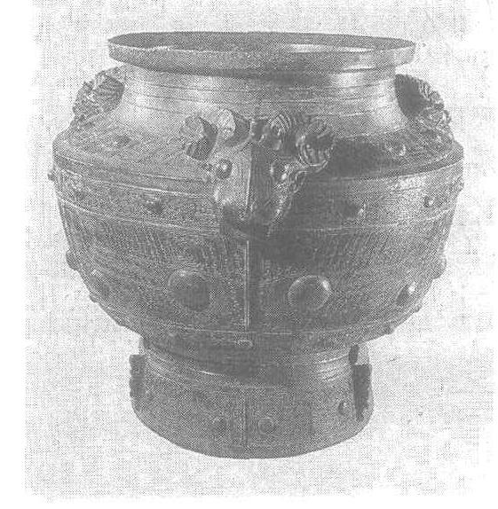 商。古代盛器。高52厘米,口径41.3厘米。重51.2公斤。北京故宫博物院藏。此瓿厚唇,折肩,腹下敛,高圈足。口沿下饰三道弦纹。肩部有三卷角羊首,饰目雷纹。腹部饰饕餮纹,夹以目雷纹带。圈足上部有弦纹两道,下部为饕餮纹,并有镂孔和三道短扉棱。此瓿形体较大,纹饰却极精致。