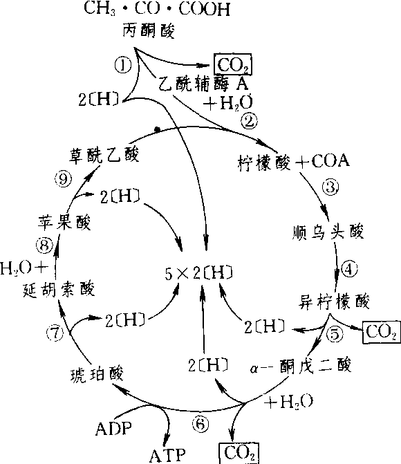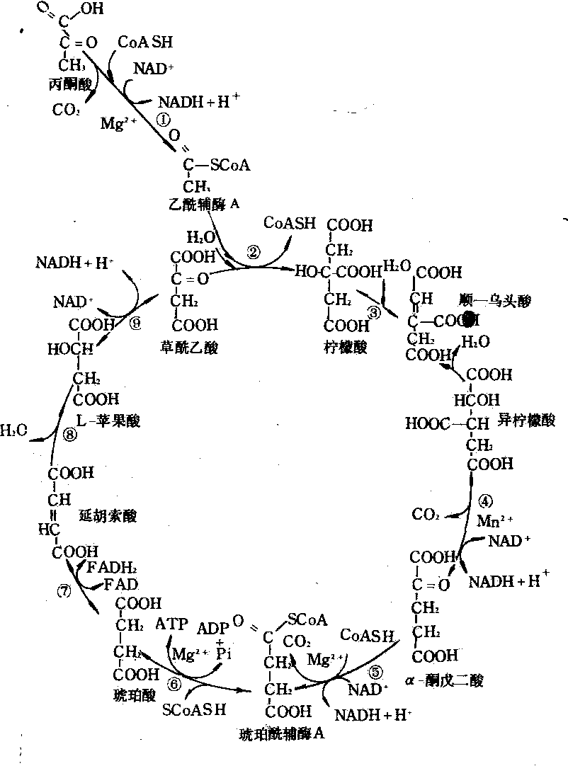 生理意义 三羧酸循环的生理意义可从能量转换和物质代谢两方面来考虑。从能量转换看,己糖酵解生成的丙酮酸,如进行乙醇发酵或乳酸发酵,则一分子己糖只产生2分子ATP,即2个高能磷酸键; 如进入三羧酸循环继续氧化,则一分子己糖可产生38分子ATP。在三羧酸循环中,通过底物水平磷酸化作用能直接形成GTP,GTP在能量上与ATP相当,即GTP+ADP⇌ATP+GDP, 其平衡常数为1.0。脱氢反应形成的NADH+H+和FADH2,在呼吸电子链中通过氧化磷酸化作用产生ATP。一分子NADH+H+产生3分子ATP;一分子FADH2产生2分子ATP。所以一分子丙酮酸通过三羧酸循环和呼吸电子链彻底氧化。可产生15分子ATP。好氧生物进行生命活动所需的能量,主要依靠三羧酸循环供应,这就是三羧酸循环普遍存在于所有好氧生物体的原因。从物质代谢看,三羧酸循环不是简单的分解代谢,而是将合成代谢和分解代谢二者的功能组合起来的一种无定向代谢途径。三羧酸循环与许多重要的代谢循环相联系。许多重要的生物物质是从三羧酸循环的中间产物衍生的,如三羧酸循环中产生的酮酸是合成氨基酸的重要原料,特别是天门冬氨酸、谷氨酸和从它们衍生的其他氨基酸。琥珀酰辅酶A是合成卟啉的前体,叶绿素、血红素和维生素B12都是卟啉化合物。乙酰辅酶A是合成脂肪酸、萜类和甾类的前体。三羧酸循环通过草酰乙酸转变为磷酸烯醇丙酮酸,又可重新合成糖类。 三羧酸循环简称“TCA”,又称“柠檬酸循环”、“克雷伯斯循环”。由生物化学家克雷伯斯(Krebs)于1937年发现。大多数活细胞中心代谢的一组循环反应,也是代谢途径的核心。过程是:乙酰CoA和草酰乙酸缩合成柠檬酸,后者在各种酶的参与下经异构、加水、脱水、脱氢、氧化、还原及乙酰CoA的参与等步骤,最终又生成草酰乙酸,这样构成了一个循环。每循环一周,1分子乙酰CoA完全氧化为二氧化碳和水,同时释放大量的能量。 三羧酸循环见“生物化学”中的“三羧酸循环”。 三羧酸循环tricarboxylic acid cycle又称柠檬酸循环或凯氏环,简称TCA循环。生物体内乙酰辅酶A氧化脱羧的一个环式反应序列。在线粒体衬质中进行。糖酵解产物丙酮酸脱氢脱羧生成乙酰辅酶A与草酰乙酸缩合成柠檬酸是三羧酸环中的第一个产物,经过顺序性的7步酶促反应,重新生成草酰乙酸,而乙酰辅酶A被氧化为CO2和水。三羧酸循环主要是受氧、ADP/ATP 和 NAD+/NADH+H+比值的调控。总反应式为:丙酮酸+4NAD++FAD+GDP+Pi+2H2O→ 3CO2 +GTP + 4NADH +4H++FADH2 。1分子NADH和FADH2通过氧化磷酸化可分别产生3分子和2分子ATP,因此三羧酸循环是需氧生物所需能量的主要来源,也是生物体内糖、蛋白质、脂肪、核酸等物质代谢的枢纽。许多重要的生物活性物质是三羧酸循环中间产物的衍生物。