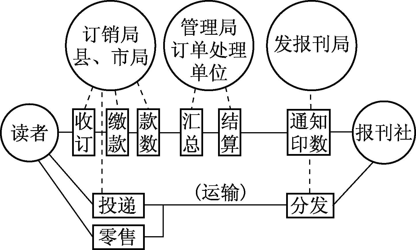 邮政企业从收订报刊到把报刊送到读者手里的全部过程。其主要工作环节为收订、缴款、要数、汇总、结算、通知印数、分发运输、投递或零售。