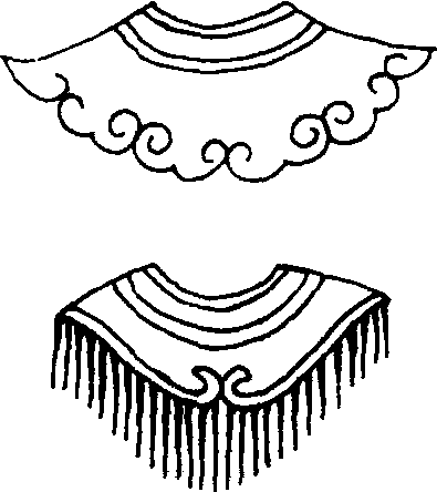 披领 披领为清代帝王、百官、嫔妃、命妇等在穿着礼服时所配戴的披饰,披领也称大领、披肩。披领穿在礼服之外,围在脖子上,用带子系于衣领下,披领两端呈尖状,有冬、夏两种。冬天为紫貂或用石青加海龙嵌缘,夏天为石青加片金缘。披领以不同的纹饰与颜色来区别尊卑贵贱,《清稗类钞·服饰》中记载:“披肩为文武大小品官衣礼服时所用,加于颈,覆于肩,形如菱,上绣蟒。”这种穿着方式始于努尔哈赤,并规定帝王、百官、嫔妃等只有在重大礼仪场合时才能配戴,其余一般的场合则不准配戴,这种规定一直延用。