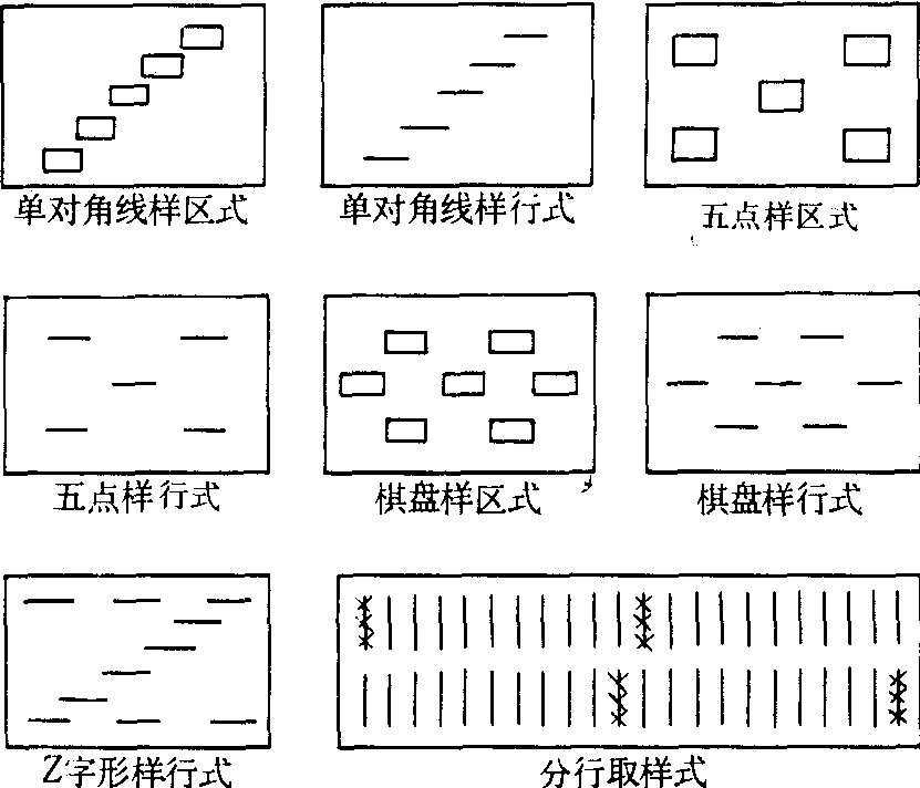 抽样sampling根据对总体部分样本的调查结果,来估算总体的方法。具相同性质的一群事物叫总体,总体是有限的且肯定存在的,并具有一定容量或数量。如稻田纵卷叶螟和褐飞虱各为一个总体。总体的数量过大时,一一数清必然困难,通常采用抽样的方法,通过样本的计算,可以获得总体的资料。抽样是以总体的分布规律和大数定律为依据的。按其分布型选用适当的抽样方式,从总体随机选取一部分抽样单位,已确定的抽样单位需全部调查,且不能用别的单位代替。大数定律是:具有小概率的事件出现可能性是很小的,有时可以忽略不计;若某一事件的概率很大,则出现可能性大,大数定律就是要找出概率接近1的规律,以随意接近于1的概率来估算某事件的发生。抽样调查所获的平均数是估计值,从样本所得的估计值与总体的绝对值或真值的差异,称抽样误差,一般是用样本平均数标准差(S)表示。昆虫学调查中,抽样用于种群密度调查、自然种群生命表研究、害虫为害程度调查、害虫预测预报和害虫防治效果调查等方面。 抽样方法 按组织的方式,抽样方法可分:随机抽样,分层抽样、多级抽样,序贯抽样和系统抽样等。一般常用的抽样方法,可分别采取以下方法抽取抽样单位(见图):❶五点抽样:适于密集的或成行的植物及随机分布型的昆虫调查,可按面积、长度或植株数作抽样单位; ❷对角线抽样:适于密集的或成行的植物及随机分布型昆虫。又分单对角线和双对角线两种; ❸棋盘式抽样;适于密集的或成行的植物及随机分布型或聚集分布型的昆虫; ❹平行线抽样:也称分行式抽样,适于成行的植物及聚集分布型的昆虫; ❺Z形抽样:适于嵌纹分布型的昆虫。