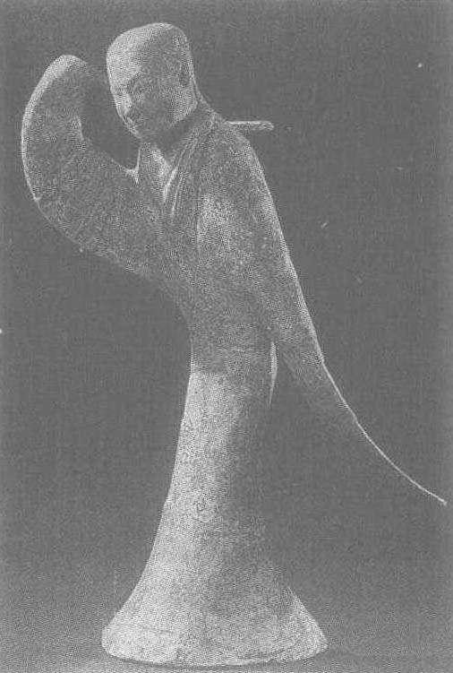 | 释义 | 拂袖舞女陶俑西汉。高49厘米。1954年陕西省西安市白家口出土。北京中国历史博物馆藏。此女俑发中分而后拢,着交领宽袖长衣,至底部撒开。她的脸形椭圆,五官端正。右手扬起,长袖甩至肩后,左手臂向后甩,上体微前倾,其舞姿如同藏族舞。她的身体在瘦长合身的长裙包裹下显得十分窈窕,与双臂动作结合所形成的线条十分流畅而富有韵律。再配上她那含蓄、发自内心的微笑,使人领略到一种纯洁、朴素、动人之美。是西汉陶俑中的精品。