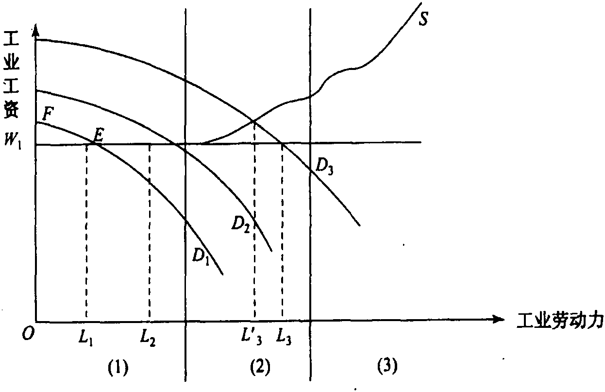 图7 拉尼斯-费景汉模型 图中,D1、D2、D3分别表示不同资本量下的劳动需求曲线,S表示劳动供给曲线。第(1)部分对应劳动力无限供给的阶段;第(2)部分对应伪装失业者被工业吸收的阶段;第(3)部分对应农业现代化的阶段。 在第一阶段,农业部门中存在剩余劳动力,即相当一部分劳动的边际产出为0。这部分农业劳动力向工业转移时,农业的总产量不受任何影响。如果农业工资不变,则农业总产量在支付农业成本之后还有剩余,可以提供给工业部门,使工业部门的劳动力人均仍能得到和原来同样多的农产品。因此,这一阶段农业部门的人均收入没有改变,工业部门的工资也保持不变。即,工业部门毋需提高工资,就可以从农业部门源源不断地吸引劳动力,劳动力处于无限供给状态。工业规模的扩张不受劳动力成本的限制。这就为工业的进一步扩张提供了更多的资本。 在第二阶段,农业剩余劳动力已被工业吸收完毕,但还存在边际产出低于农业工资的伪装失业者。由于这部分劳动力的边际产出大于0,所以当他们转移出去以后,农业总产量会有所下降,而农业工资不变,剩下的农业劳动力仍然得到和以前相同的收入。这样一来平均农业剩余就会下降,即提供给工业部门的农产品不足以按原有水平来供应工业部门的劳动力。于是经济中开始出现农产品特别是粮食的短缺,粮食价格上涨。为了维持工业工资的购买力不变,必须使工业工资提高,才能吸引更多的劳动力。即,工业不再处于劳动力无限供给的状态中。而工人工资的提高会使企业主的利润减少,工业扩张减缓。 在这一阶段,由于转移出去的农业劳动力边际产出大于0,所以即使粮价上涨,农业剩余也不能满足工业劳动力的需求。那么如何才能补偿工人不能由农产品满足的需求呢?惟一的解决办法是用工业品来替代。问题在于,人们对粮食的需求是有一个最低界限的。如果农业工资本来就十分接近刚能维持生存的水平,那么用工业品来替代粮食的不足将是非常困难的。由此可见,农业的发展水平会对工业乃至整个经济发生影响。 当农业中的全部伪装失业者都转移到工业部门以后,经济发展就进入了第三个阶段。此时农业劳动力是按其边际产出取得报酬,在这一点上与工业劳动力已经没有区别。农业工资水平不再由平均产出决定,而是和工业工资一样由市场决定。于是,农业部门告别传统经济,进入商品化或曰现代化阶段。当农业劳动力数量进一步减少,以至于农业劳动力的边际产出与工业劳动力的边际产出相等时,农业劳动力向工业部门的转移就停止了。以后,劳动力的配置将不再受部门的限制,而是在整个经济中按照边际效益最大化的原则进行配置。这样,二元结构转化成了现代化的一元结构,以后的经济发展就遵从新古典增长理论了。 拉尼斯-费景汉模型强调了农业对工业的贡献不仅在于提供工业部门所需要的劳动力,还为工业部门提供农业剩余。如果农业剩余不能满足工业部门扩张后新增工业劳动力对农产品的需求,经济增长和劳动力转移就会受到阻碍。因此,在鼓励工业部门扩张、加快经济增长的同时,也不能忽视农业。 |